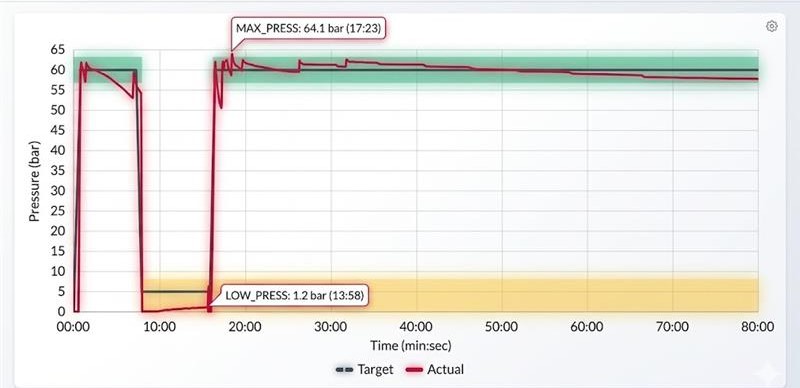 Interactive graph allows precise zooming of the pressure vs time enabling you to analyze every detail and make informed decisions.